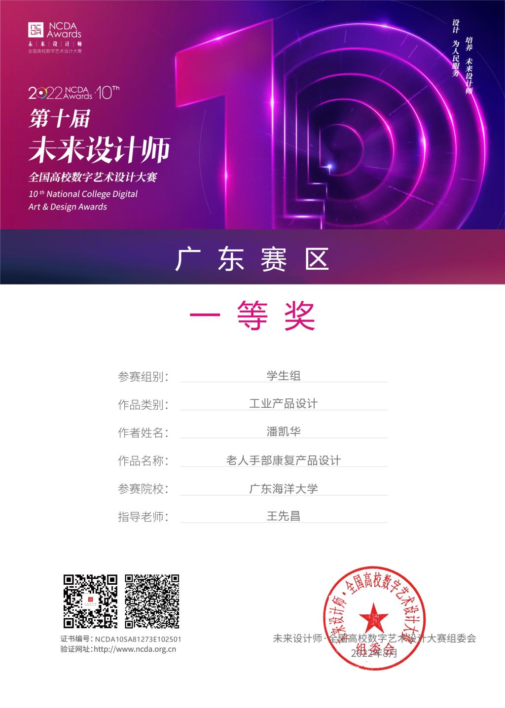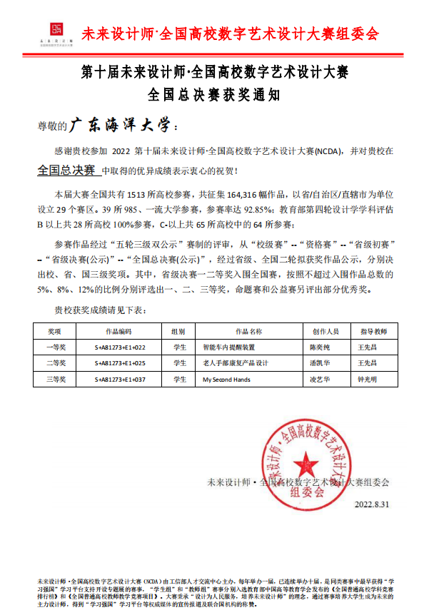 近日,第十届全国高校数字艺术设计大赛传出喜讯,公司工业设计专业员工在全国高校数字艺术设计大赛广东省赛区获得广东省一等奖7项、二等奖10项、三等奖14项,在随后进行的全国总决赛中获得一等奖1项、二等奖1项、三等奖1项的佳绩。