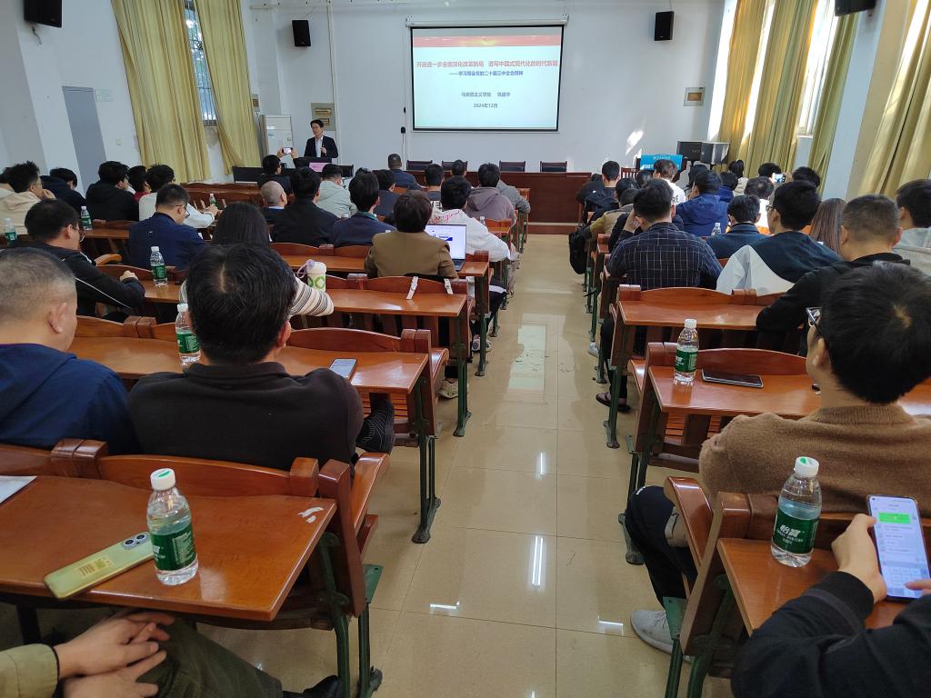 为进一步深入学习贯彻党的二十届三中全会精神,12月18日下午,beat365官方登录邀请公司党委理论宣讲团第四届成员,马克思主义公司巩建华教授在工程训练中心102举行学习贯彻党的二十届三中全会精神宣讲报告会。报告会由公司党委书记张懿主持,全院80余名教职工和员工党员参会。