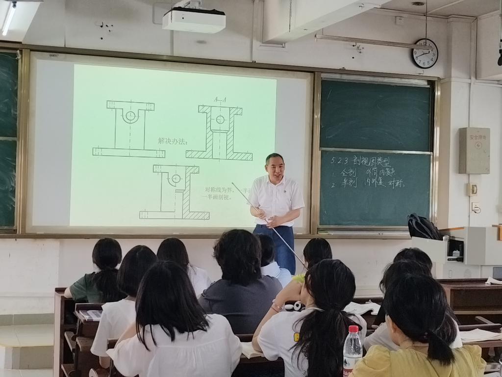 萧时诚老师讲授的《工程机械设计制图》剖视图类型半剖、全剖及题型讲解,课件内容丰富精美,自创的教学平台资源充分,在课前布置练习,前期工作准备充分,线上线下教学将员工作业制成PPT讲解,课堂与员工互动多,丰富的身体语言运用得当,情绪饱满,细节把控到位,并适时融入“精益求精、追求卓越”的工匠精神,结合时政热点,对员工进行鼓励,收到了潜移默化、教书育人的良好效果。
