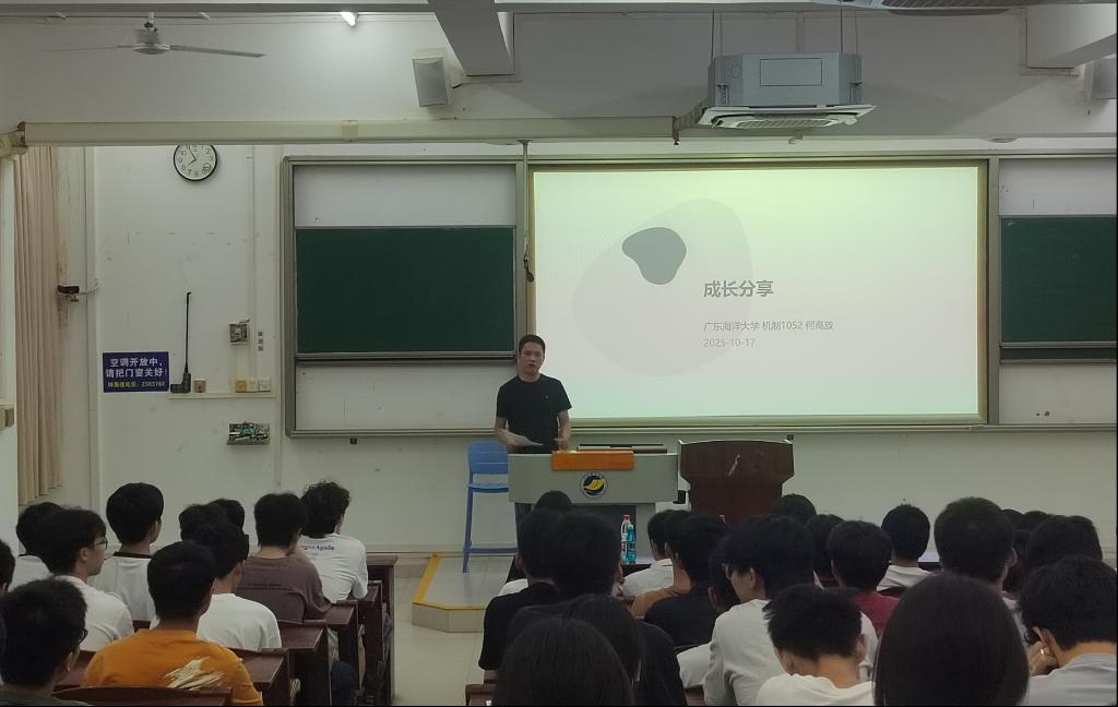 活动的另一高潮是优秀员工分享环节。公司杰出员工、现任广东百源实业有限公司首席增长官(CGO)何高放先生受邀担任分享嘉宾。他以学长身份深情回顾了在校期间参与科创竞赛对其职业发展的深远影响,结合自身从校园到职场的成长轨迹,分享了职业规划、能力培养与职场心态的独到见解。幽默风趣的表达与“干货满满”的内容引发同学们强烈共鸣,互动环节中大家争相提问,何高放先生一一耐心解答,现场气氛持续升温。