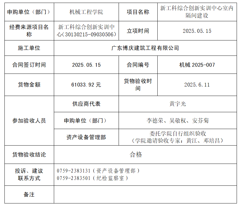 beat365官方登录新工科综合创新实训中心室内隔间建设项目已验收,现将验收结果公示,公示时间:2025年6月12日-6月15日。